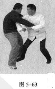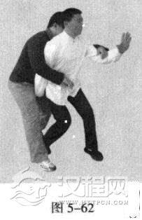 5.敌从背后连身带臂将我抱住(图5-61)。我身体下沉,先以手击敌档部(图5-62),然后猛然腰部转动,转动中两臂突然前后分开.以肘部击打敌人腹部。(图5-63)