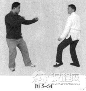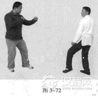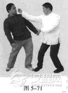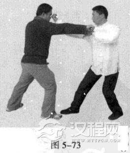 4.敌左势.以过步右拳猛击我头、胸部位。我左势,左脚快速收回撤于右脚后,同时,左手从上向后下方持压敌方攻来之手臂,右拳则由下向上击打敌人下颏或头、面部。(图5-72图5-73)