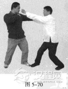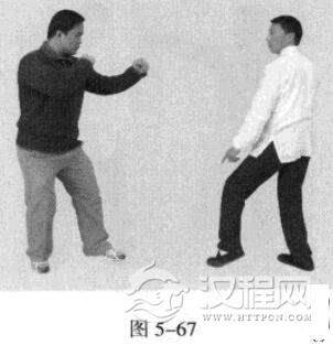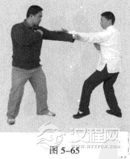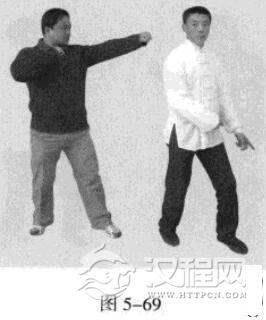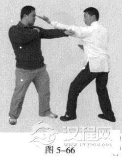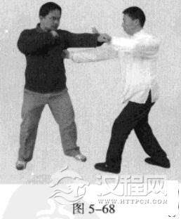 2.敌左势.左直拳击我头部。我左势,左手往下划圆,压持对方手臂,同时.右拳由下向上击打敌人肋部,左脚同时向前踩进一步。(图5-67,图5-68)