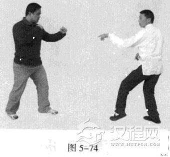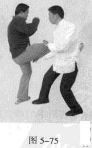 5.敌右脚蹬踏我前胸。我左势.左脚向左侧移动一小步.左手顺着敌人蹬来之劲托其大腿或腿弯处.接着.右脚过步向前踩出.同时,右臂由其大腿下穿过,以右手击敌档部(图5-74,图5-75),或以不伤其身的臂部持续向前上方推挑发力,使其失去重心而跌仆。