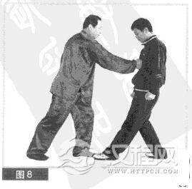 (1)双方均左前势对峙。我方先发出招,突起右拳,只奔对方胸部猛力击打。(图8)