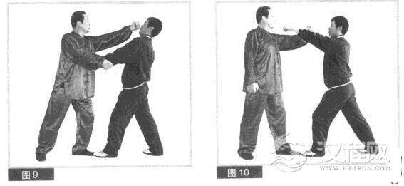 (2)对方速用左拳向下、向左拦挂我右拳。我双拳连击,随即用左拳向前直击对方头部。(图9)