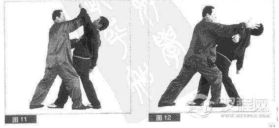 (4)我攻中有防,防打兼用,用右拳快速向上迎架对方左拳,同时右脚向前迈一步,抽落对方左脚后侧,左手成立掌向前推靠对方胸部。(图11)