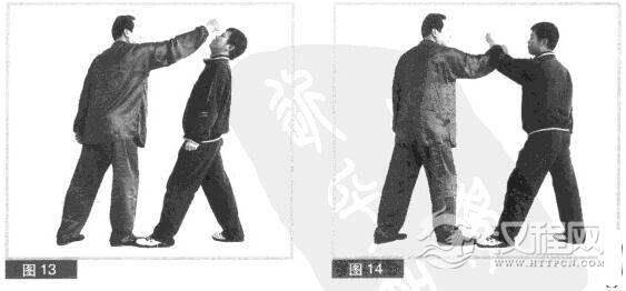 (2)对方急忙向后仰头闪我右拳劈打,同时用左拳向右迎挡我右拳。(图14)