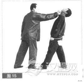 (3)我右拳下劈落空后迅疾臂外旋向上、向前用拳面摧打对方下颌部位。(图15)