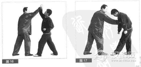 (4)对方急忙向后滑步、缩身、仰头闪我右拳援打,同时用右拳向上迎挡我右拳。(图16)