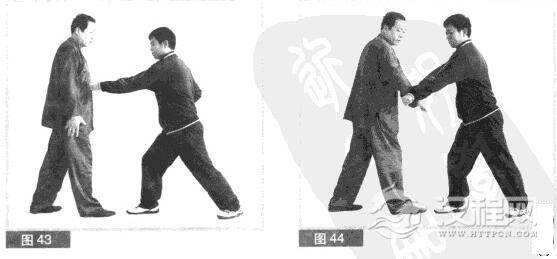 (2)我向后稍缩身躲闪对方左拳击打,同时用右拳向下磕砸对方左拳。(图44)