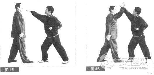 (3)对方使用连环技法.随即用右拳向前直击我头部。(图45)