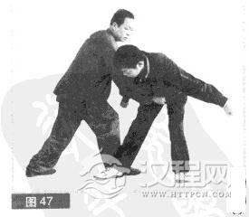 (5)我右腿走龙形步法.快速向前上步落至对方右腿后侧,与右腿落步同时.右拳向前撩打对方档部,重挫对方。(图47)