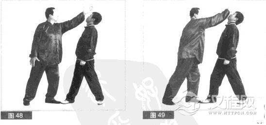 (2)对方用右拳向上迎挡我左掌,我即用右掌向前必击对方头。(图49)