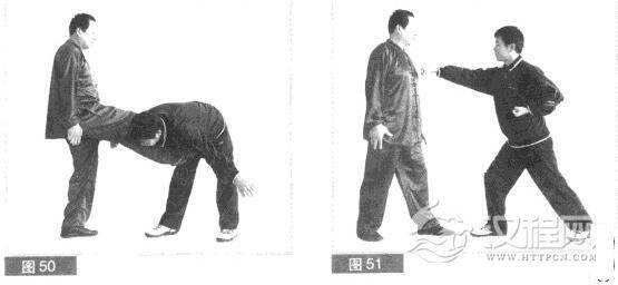 (1)双方对峙势同上。对方突用右拳向前直击我胸部。(图51)