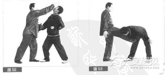 (2)我用左掌向下劈砸对方右拳,拦其击打;同时,右掌向前、向下劈击对方头部。(图52)