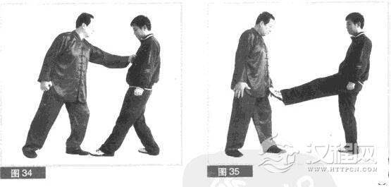 (2)对方后仰身闪躲我击打.同时,提左腿用左脚向前弹踢我小腹部位。(图35)