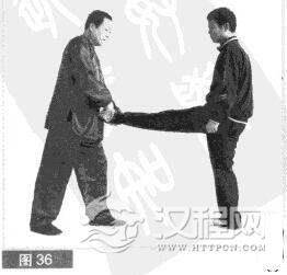 (3)我稍缩身闪躲对方踢瑞,双手向下抓住对方左脚。(图36)