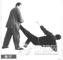 (4)上动不停.我左脚向后撤步,双手抓牢对方左脚,向左向上拉拽旋拧,使对方失重,失衡侧于地上(图37)