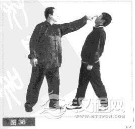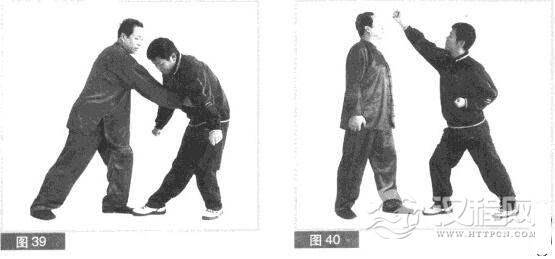 (2)对方头部后仰,右拳向上迎架我左手,躲闪,迎拦我左手插击。我抓住对方腹部前突之机,右拳向前猛力击打其小腹部位。(图39)