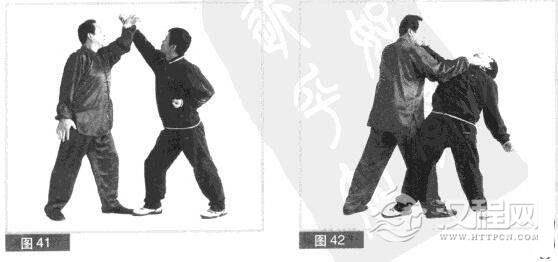 (4)我急用左拳向上迎架对方右拳。(图41)