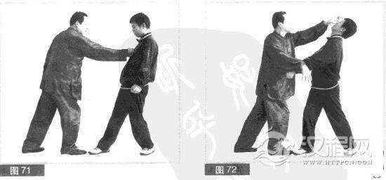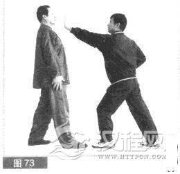 (3)对方用右拳向上迎挡我左手.并用防中进攻之法.左脚向前上一步,用左掌向前搓击我下颌部位。(图73)