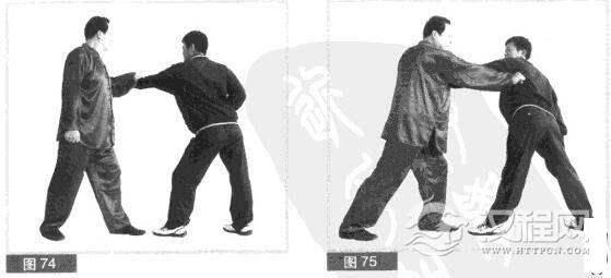 (5)我左手继续向左、向下纯拧对方左小臂,右拳同时向前、向左,横擂对方左肋部位。(图75)
