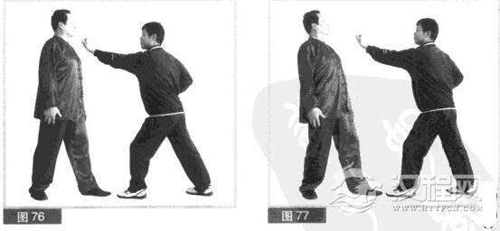 (1)双方对峙,对方左脚向前上一步,用左拳猛力向前摇击我下颌部位。(图76)