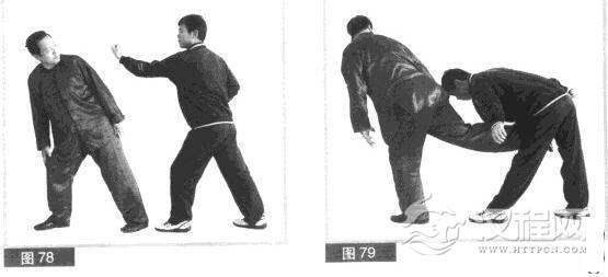 (4)我左脚向前滑半步并站稳,右腿提起,用右脚向后、向上撩踢对方档部。(图79)