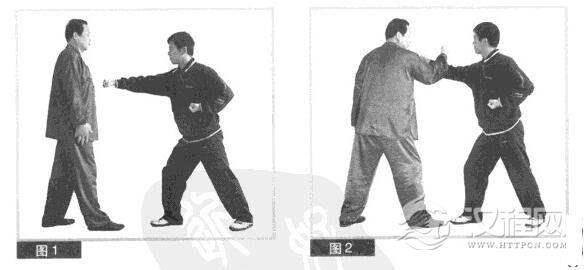 (1)双方欲搏.右前势对峙。对方(穿运动服者)抢攻先打,突发右拳,向前直击我胸部。(图1)