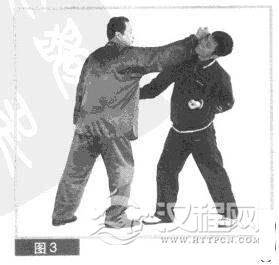 (3)紧接不停,我右拳挎磕对方右拳后,即用拳背向右前上方反砸其头右前部位。(图3)