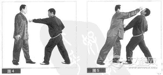 (1)双方左前势对峙。对方主动发打,用左拳向前猛力击打我胸部。(图4)