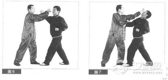 (3)对方急向后仰头闪我拳砸,同时用右拳向上、向左、向下拦挂我右拳。(图6)