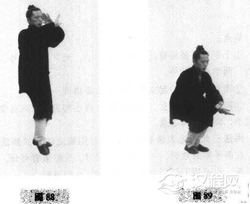2.左右手各自沉臂转而分开划弧,随着身体徐徐下蹲而再交叉于膝前(图99)
