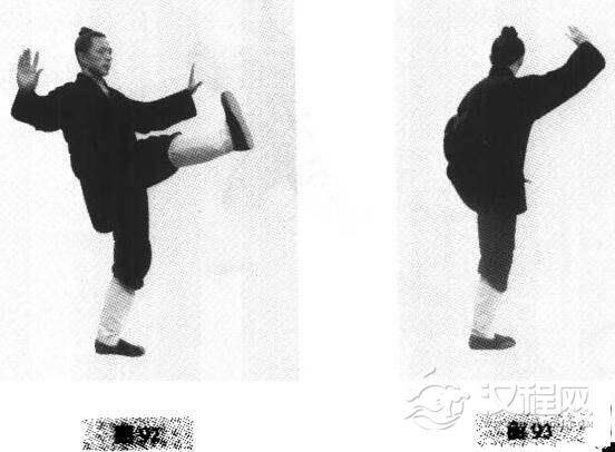 2.重复上式“十字分脚”之动作2(见图89)后,再随身起立而提起左腿。再向右边(东)蹬出后,随身、腰左转而摆腿180度,向左(西)蹬出,两手随身体转动划弧,左手意在左脚之上(图92、图93)