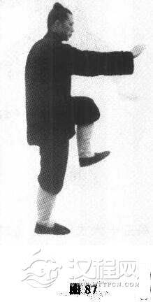 2.上动不停。右脚承受全部重心,在左右手在胸前划立圆之时,提起左脚,随即右手平推出去(图87)