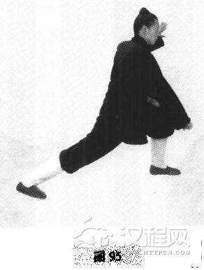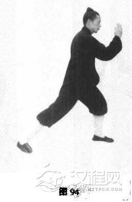 1.在“分摆蹬腿”之后,左脚落地时左手成楼膝拗步式,从左膝前划弧,左手随转身转掌推出(图94)