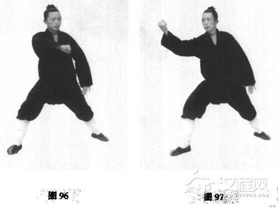 2.右臂沉肘、翻拳,右拳从胸向上从右划弧翻拳而出,拳面朝上(图97)