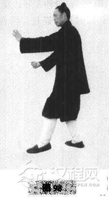 1.腰身右转,重心渐移至右腿;意以先右靠背,右臂屈肘,左手随身向左下划弧(图96)