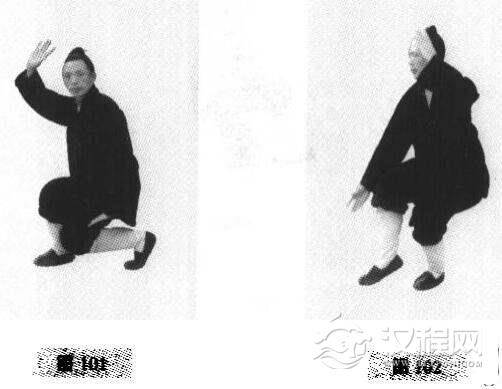 1.身体右转,收回右脚,右脚斜插左脚之后,身体慢慢右转下坐成歇步;两手分别从两边右手向上,左手朝下划弧(图101)。