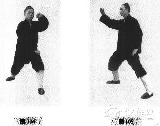 ③右披身势中变步上势要圆顺自然,手经过膝前要有楼膝之势;