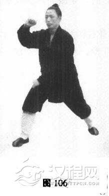 3.右打虎。腰身继续右转45度,左手与左脚由外向身内划弧,左脚落地于右脚斜步尺许;左手在上平肩,左脚承担重心,右脚提起,向右前方划弧迈出尺许,左右手同时划弧翻掌变拳,成右弓步,右拳在头前,拳面朝外,左拳拂于右膝上,拳眼朝下(图106)
