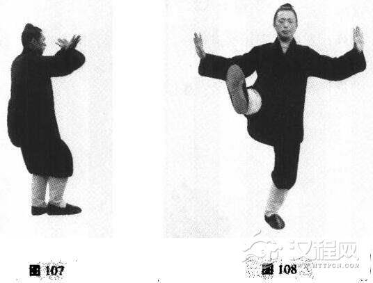 说明:此式作为重复和连接两式的过渡式子,在蹬脚时要专注与上式稍异。其要点及用法均与前相同。