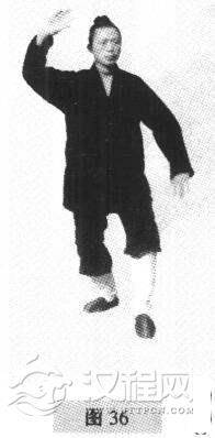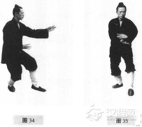 动作:上动不停。重心渐移至左腿,右掌坐腕后随身往前,下推出护在小腹与档之前;而右腿随跟而上,至左脚边落地,承受重心;左手由下向后、向上、再向前,即外旋至前,与左脚同时。左脚提起向前距原地一小步落下,先以脚跟着地,脚尖微翘,后虚平左脚,成左虚右实步,两掌掌心相对,目视左掌中指肚(图34,接连接动作图35、图36)