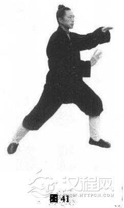 动作:接上式。提左脚,向左侧横开一尺许,同时左臂呈拥弧形一起横格,重心由右腿渐移至左腿,右手顺身手在左臂下端推掌坐腕,成左弓步(图41)。