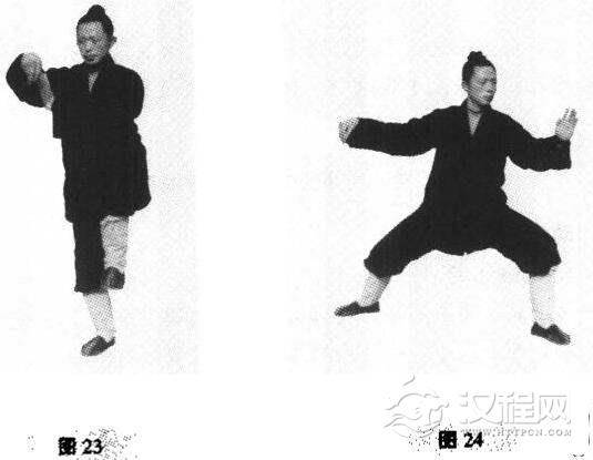 重心仍在右脚,右手由掌变成勾手,气下沉,左脚、左手由腰带动一起向左前方挥迈而出.变成左弓箭步(图23、图24).
