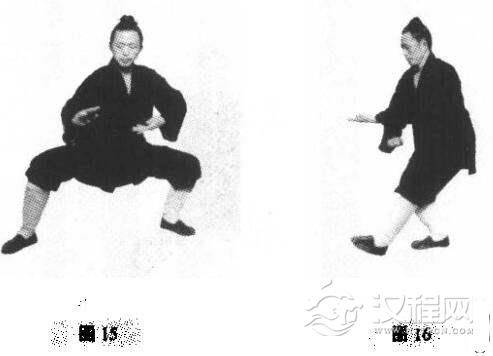当左右两手交叉会于右膝时,两手随臂转翻掌,并楼过右膝,收回腰间后从腋下推按出去;同时当手搂过膝盖时.右脚提起。蹬脚后落地,肘至脚到手到,成马步双按掌式(图17,图18)。
