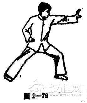 (1)左脚前踏成登山势,而左掌朝脸部前方推出,右拳回置于腰际(图2一79)。
