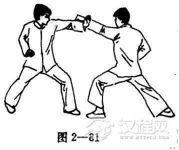 (2)右脚大踏出一步成登山势,右拳朝左上方回转划出,右手腕与左掌接实(图2一80)。