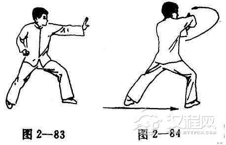 (2)右脚向前踏成登山势,再回转右拳突击左侧(图2一84)。