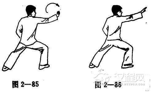 (4)右拳打开成掌且往前推出,其次左右相对出招,主动出击对手(图2-86)。