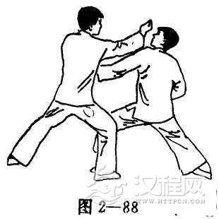 以圈捶攻击对手时,若其采用低姿势,则勿忘出左掌扣压来拳,同时以右拳敲击对手之面门(图2-87、88)。