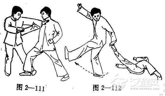 (2)随后将对手放倒地面上,同时做出防卫动作,以免被其从后面攻击(图2-112)。