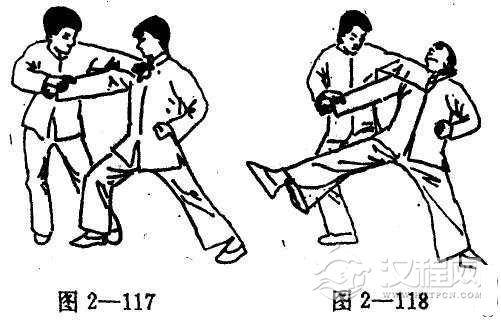 (1)若对手的下盘稳固不易钩倒时(图2-117)。